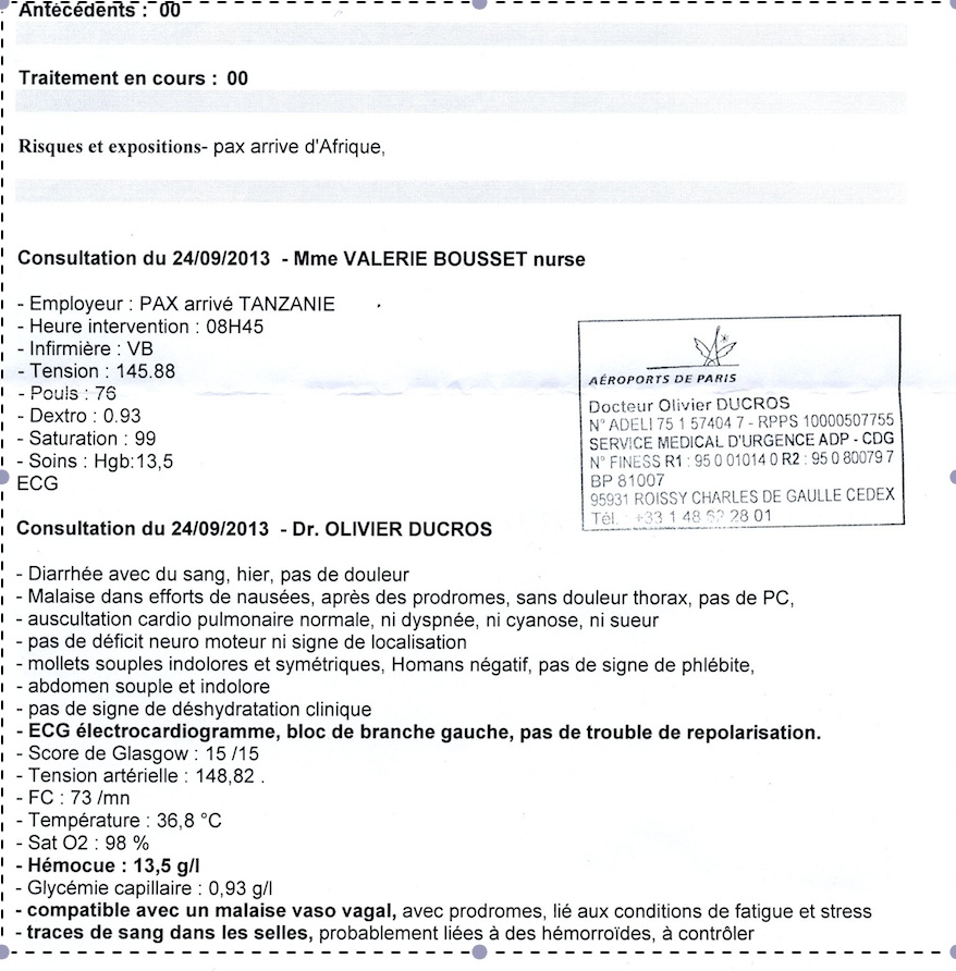 Un passager en provenance d’Afrique fait un malaise dans l’avion. Après l’atterrissage, il se rend à la clinique de l’aéroport. Il attend cinq minutes, une infirmière le prend en charge, vérifie la pression, fait un électrocardiogramme, mesure le taux d’oxygénation et quelques autres paramètres. six minutes plus tard, un médecin reçoit le passager, l’ausculte, pose des questions sur l’incident, consulte les résultats des examens.